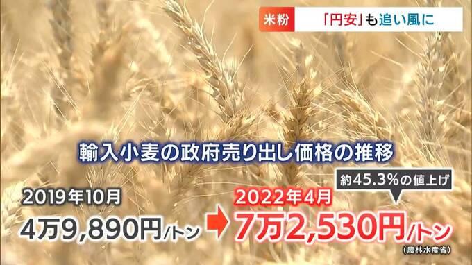 さらに追い風となっているのが、世界情勢や円安による輸入小麦価格の上昇です。小麦の政府売り渡し価格が2019年は1トンあたり約5万円だったのに対し、2022年には7万2千円あまりまで上がりました。