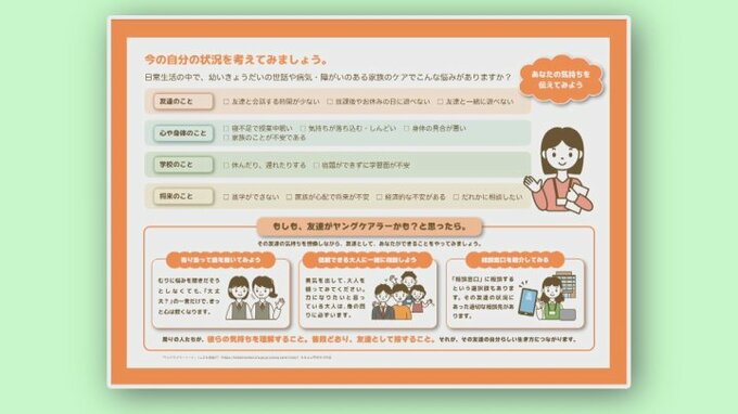 ハンドブックではケアと手伝いの違いや経験者の声、それに相談窓口などを紹介しています。