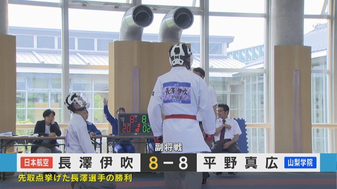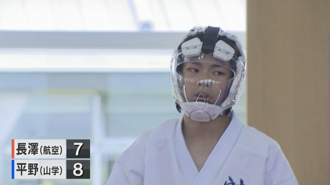 しかし、航空2年、春日居中出身の長澤伊吹選手は得意の上段突きで1ポイントずつ返し、残り5秒で1点差に。