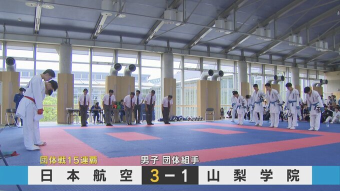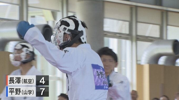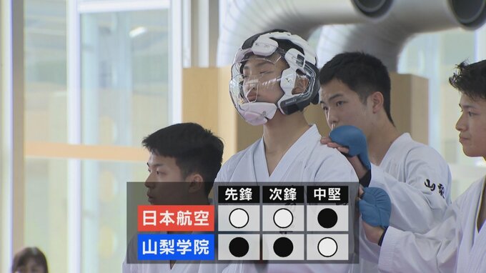 序盤から山梨学院3年の平野真広選手が突き技を着実に重ね、3ポイントリード。