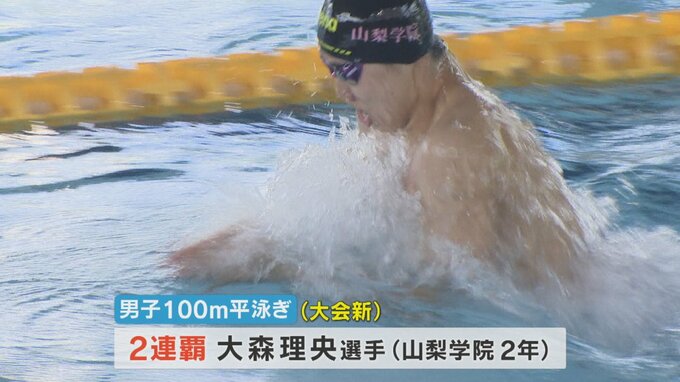 そして100m平泳ぎは山梨学院の大森理央選手が自身の大会記録を2秒も上回る新記録で連覇しました。