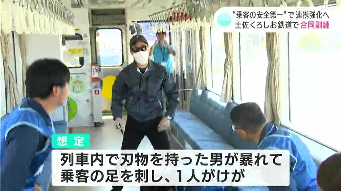 コロナの影響で4年ぶりとなった土佐くろしお鉄道安芸駅での訓練。9日は、土佐くろしお鉄道の職員のほか、警察官や消防隊員合わせて46人が参加しました。列車内で刃物を持った男が暴れて乗客の足を刺し、1人がけがをするという想定で、参加者は暴れた男を制圧する方法や、ほかの乗客の避難誘導、警察や消防への連絡方法などを確認していました。