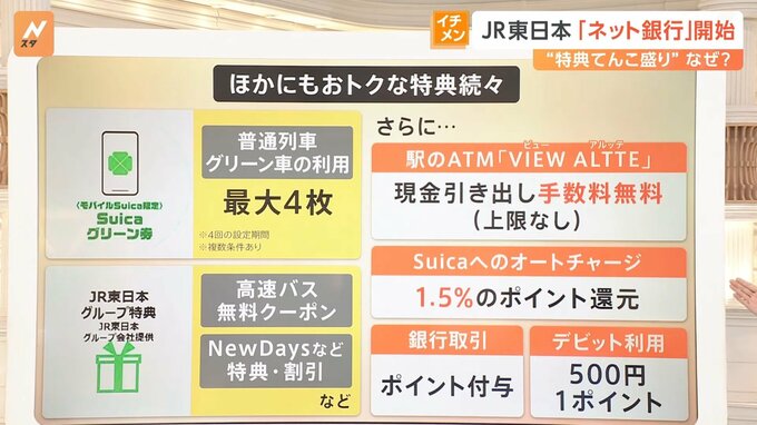 さらに、駅のATM「VIEW ALTTE」での現金引き出しの手数料は無料で上限もないそうです。他にも、Suicaへのオートチャージでは1.5%のポイント還元もあり、銀行取引ではポイント付与、デビット利用では500円で1ポイントなどの特典もあります。