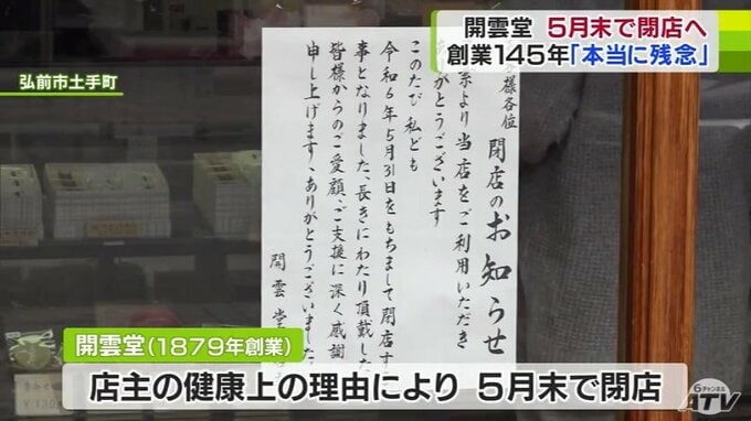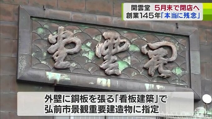 青森県弘前市土手町のシンボルの1つであった趣のある店舗。明治時代に創業した和菓子店「開雲堂」です。5月末で145年の歴史に幕を下ろすことになり、市民からは惜しむ声が上がっています。