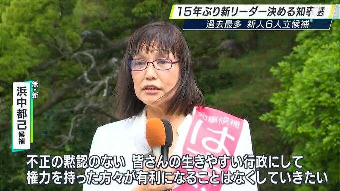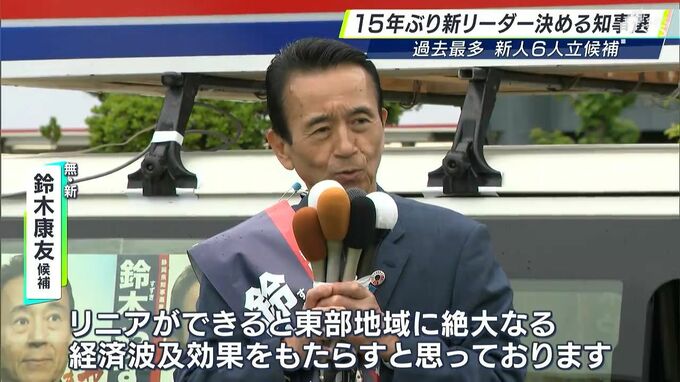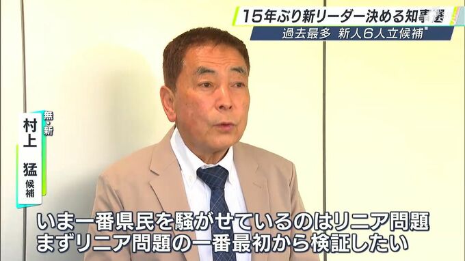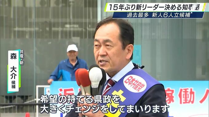知事選に立候補したのは届け出順に、いずれも新人で政治団体代表の横山正文候補56歳、共産党県委員長の森大介候補55歳、前浜松市長の鈴木康友候補66歳、元副知事の大村慎一候補60歳、自営業の村上猛候補73歳、会社役員の浜中都己候補62歳の6人です。