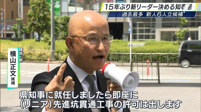 政治団体代表の横山正文候補はリニア新幹線の早期着工を訴えました。