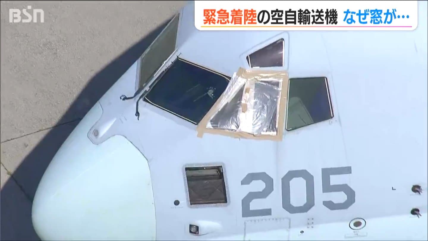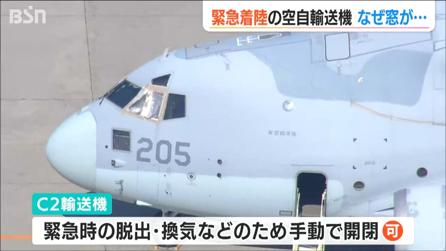 新潟空港に緊急着陸した航空自衛隊のC2輸送機を10日、上空から撮影しました。操縦席の左側を見てみると、上空で開いてしまったスライド式の窓の部分はシートで覆われていました。