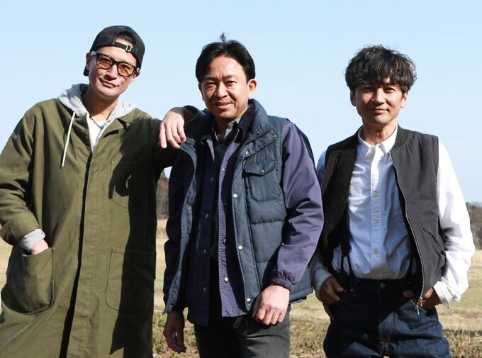 城島社長はスーツにセットした髪型で「社長然」としたたたずまい。一方、国分副社長は少し髭をたくわえた柔和な笑顔で、松岡副社長はハットにサングラスでお茶目に唇を尖らせて、各々が充実した表情を見せています。