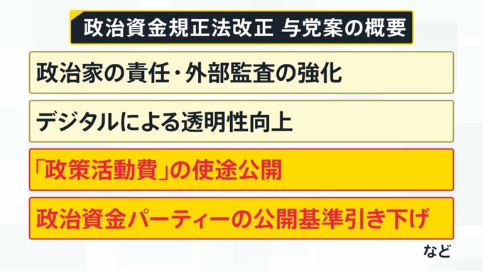かなりあいまいな案が出てきたと言わざるを得ません。特に注目したいのが、▼「政策活動費」の使途公開、▼政治資金パーティーの公開基準引き下げの2点です。