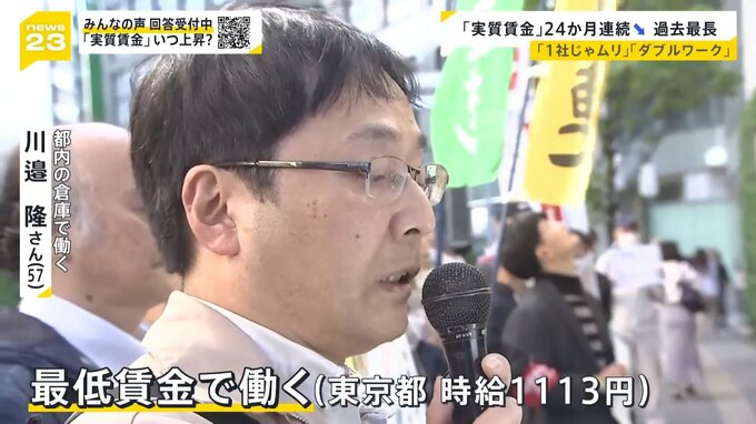 9日に発表された実質賃金は前年比マイナス2.5%で、リーマンショックを超える24か月連続の減少となりました。「最低賃金じゃ生活できない」非正規労働者の人からも悲痛な声が。私たちの賃金はいつ上がる?