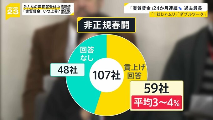 非正規で働く人たちが賃上げを求める“非正規春闘”。107社中48社からは賃上げの回答がなく、59社からは回答があったものの、平均3〜4%ほどの賃上げだといいます。