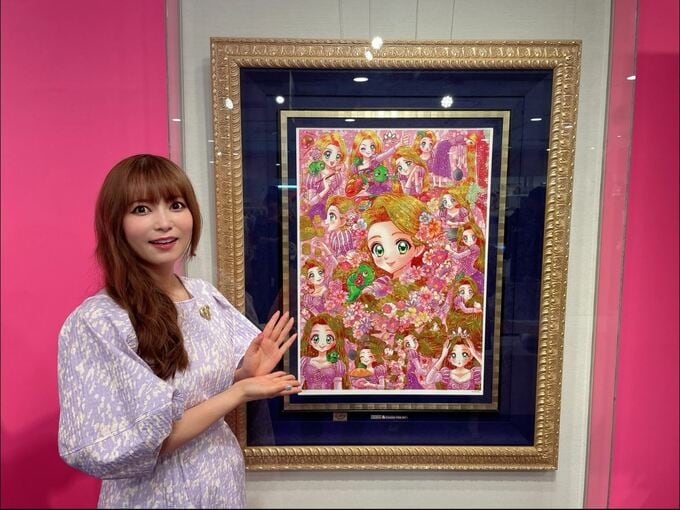 また、「5/13まで、阪急うめだにわたしが描いたラプンツェルの絵、髪が全て本当の金でダイヤがついた税込み2000万円超えのキラキラ絵が」と超高額アートも紹介。「警備員さんが守ってる絵が実物近くで見られるからぜひ見に行ってほしいです!すごいキラキラ!」と厳重警備されていることも明かしました。そして、「買うこともできます!猛者さま立ち上がって!!」と記しました。