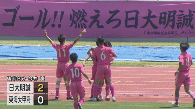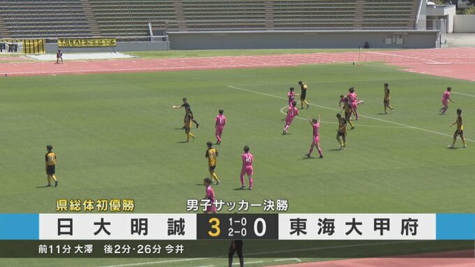 東海大甲府の反撃を無失点に抑え、3対0で日大明誠が嬉しい県総体初優勝です。