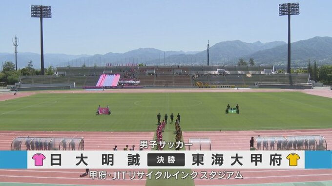 男子サッカー決勝では、3連覇中の山梨学院を準々決勝で下した日大明誠と東海大甲府の対戦。