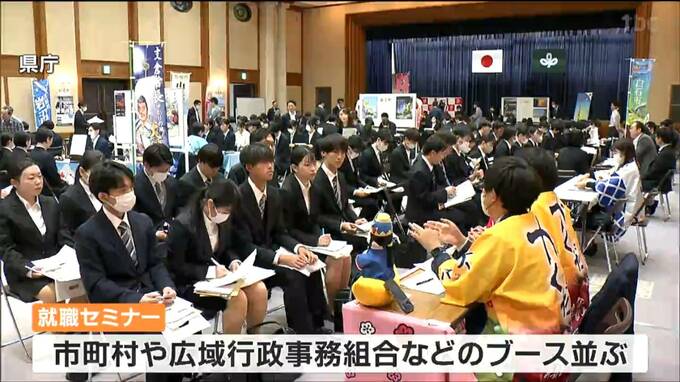 県庁で開かれた就職セミナーでは、県内の市町村や広域行政事務組合などのブースが並びました。それぞれの人事担当者が就活生に仕事の内容や福利厚生などについて説明しました。