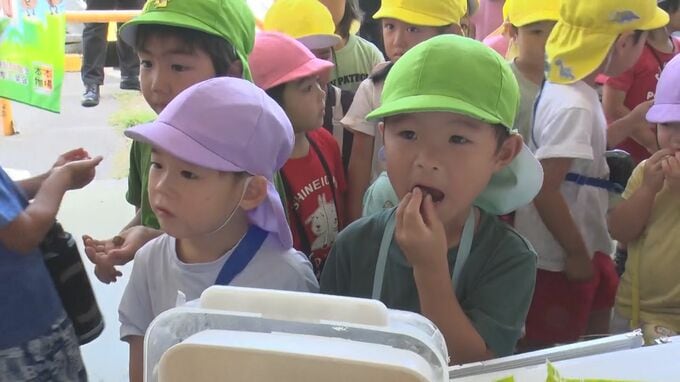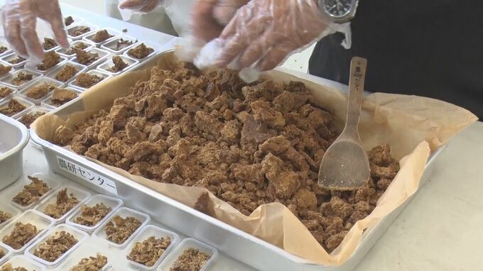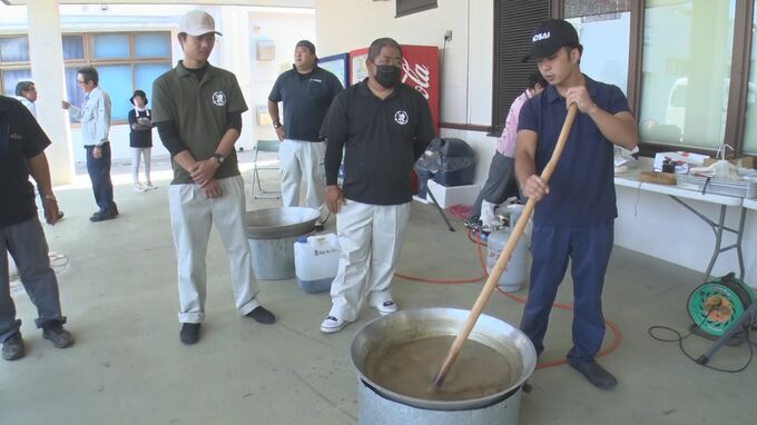 八重山地域では小浜島と西表島、波照間島と与那国島の4つの島で黒糖が作られていて、きょうJAファーマーズマーケットでは製糖工場や行政関係者らが4つの島の黒糖をPRしました。サトウキビの絞り汁を大鍋で煮詰める黒糖づくりの実演が行われ、2時間ほどで完成した出来立ての黒糖が見学に訪れた保育園児や買い物客へ振る舞われました。