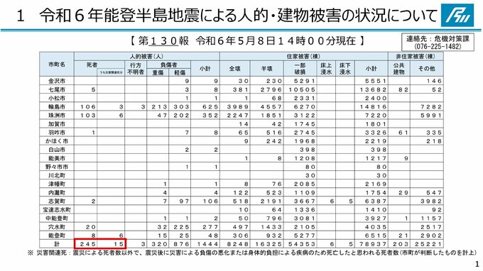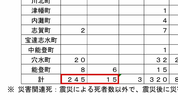 石川県が発表している能登半島地震による犠牲者の数は、8日時点で245人です。県がホームページで公表している資料では、このうち15人は「災害関連死」と記載されていますが、「震災後に災害による負傷の悪化または身体的負担による疾病のため死亡したと思われる死者数(市町が判断したものを計上)」という但し書きがされています。