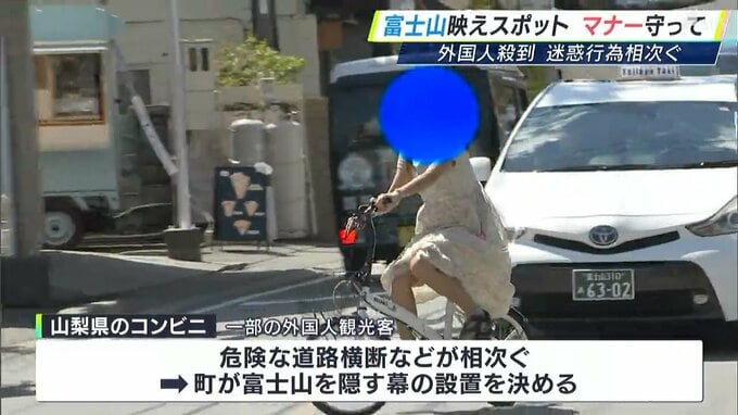 富士山のSNS映えスポットをめぐっては、お隣の山梨県でいま大きな問題が起きています。河口湖駅近くのコンビニエンスストアが、富士山と店舗が同時に撮影できるとSNSで話題になり、外国人観光客が殺到。危険な道路の横断などマナー違反が相次ぎ、町は富士山を隠す幕の設置を決めました。