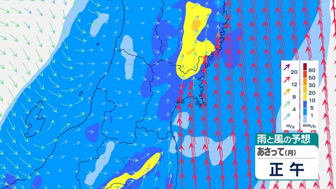 宮城県では13日(月)は、ほぼ一日を通して雨となる見込みで、特に三陸沿岸で活発な雨雲がかかりやすく、総雨量が100ミリ以上の大雨になる所があるかもしれません。南風も強まり、南側が海で開けている石巻周辺では平均でも15メートル以上の強い風が吹くことが予想され、傘があおられるような雨・風となりそうです。雨は昼前後、風は朝~昼前がピークとみています。