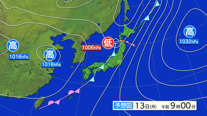 そして13日(月)は、北日本を通過する低気圧やそこから日本列島に沿うように伸びる前線の影響で、全国広い範囲で雨に。雨雲のもととなる南からの暖かく湿った空気が大量に流れ込むため、雨脚が強まり、四国や本州の広い範囲で警報級の大雨となるおそれがあります。また、等圧線の間隔が狭くなるため南寄りの風も強まり、東北地方の太平洋側で警報級の強い風となるおそれがあります。