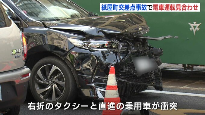 11日午前、広島市の紙屋町交差点でタクシーと乗用車が衝突する事故があり、タクシーの運転手が軽いをけがしました。この事故で広島電鉄の路面電車がおよそ1時間、運転を見合わせました。