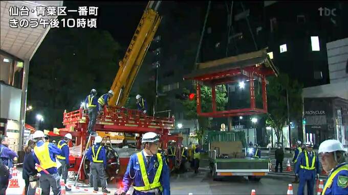 山鉾の搬入作業は、10日午後9時頃から、仙台市青葉区一番町の商店街で行われました。