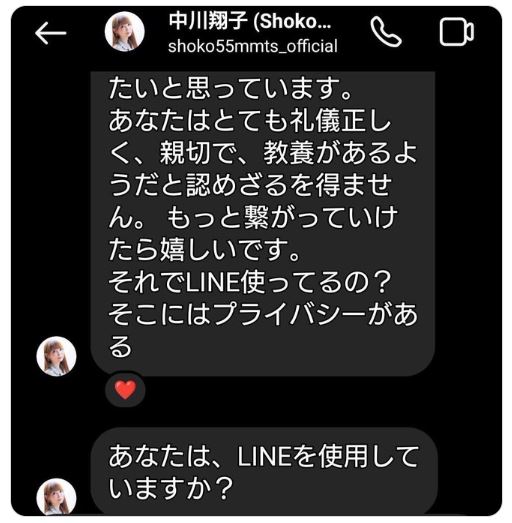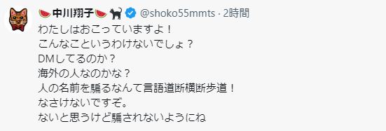 いかにも中川翔子さんから送られたメッセージのように見えなくもないのですが、文面の日本語は相当不自然であり、不審なアカウントから発信された可能性が高いと思われます。