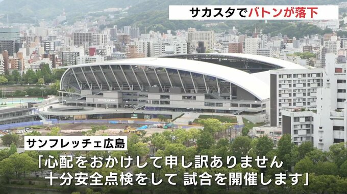 サンフレッチェ広島によりますと、11日に行われていた女子サッカーWEリーグ、サンフレッチェ広島レジーナと大宮アルディージャVENTUSの試合中、バックスタンドの上部にあったフラッグを掲出するバトンが観客席に落下しました。