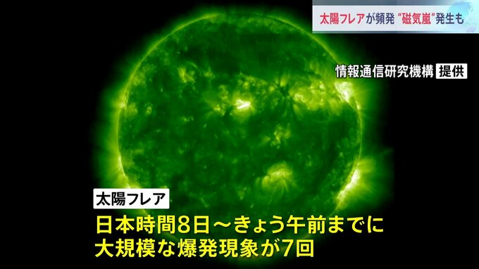 太陽の表面で起きる爆発現象「太陽フレア」がきょうも観測されました。情報通信研究機構によりますと、太陽の表面で起きる爆発現象「太陽フレア」が頻発し、日本時間の8日からきょう午前までに、大規模な「太陽フ…