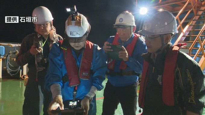 調査には民間の船が使われ、東海大学海洋学部の山田吉彦教授のほか、石垣市の中山市長や市役所職員、市議会議員なども調査に同行しました。