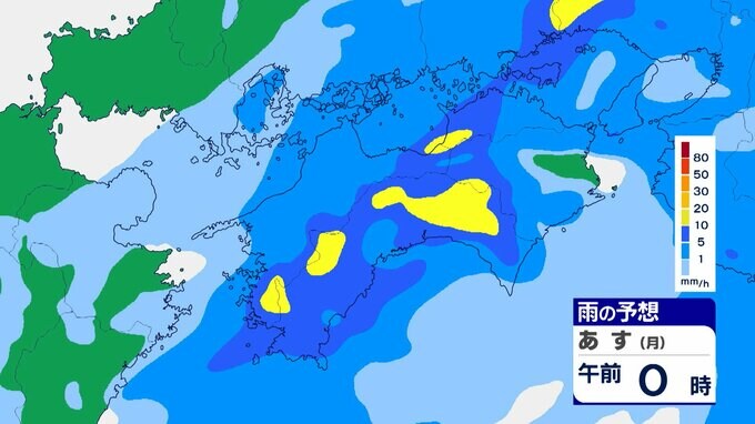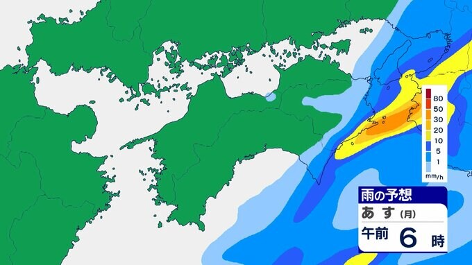 高知県内では12日夜のはじめ頃から13日未明にかけて、局地的に雷を伴った非常に激しい雨が降る見込みです。発達した雨雲が停滞した場合は、警報級の大雨となる可能性があります。13日にかけて高知県内で予想される1時間雨量は、いずれも多い所で、中部・東部で60ミリ、西部で30ミリから40ミリ、13日午後6時までに予想される24時間雨量は、いずれも多い所で、中部・東部で180ミリ、西部で120ミリです。