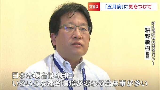 いまの時期に心配されるのが、いわゆる「五月病」です。岡山市北区の岡山県精神科医療センター・医師の耕野さんは「日常生活における環境の変化により、特にこの時期不調を訴える相談が増えている」と言います。