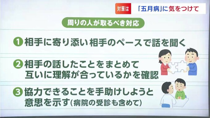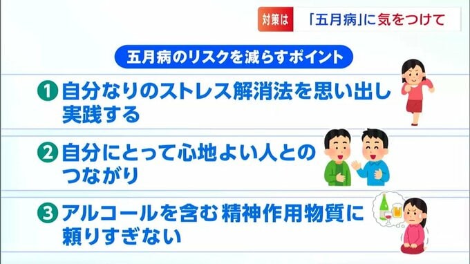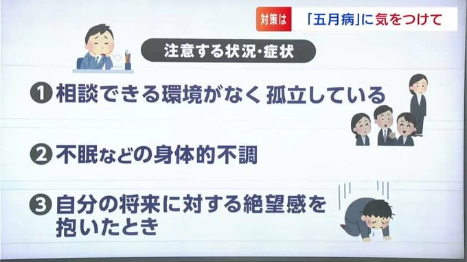 耕野さんによりますと、「五月病」では「環境の変化のなか、思うような力が発揮できず悩んだり」「悩みを解決できず、気持ちのコントロールが難しくなる」など、日常生活を送る上で支障をきたす様々な症状が出てくるということです。