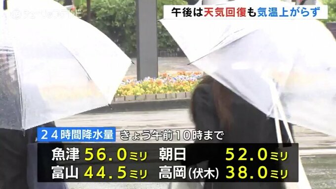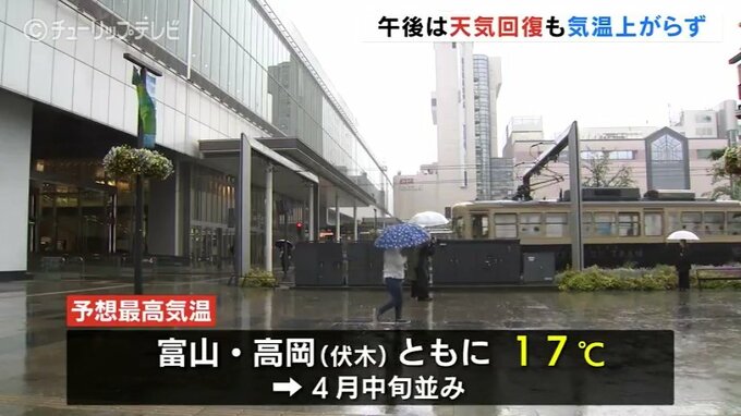 ただ、日中の最高気温はきのうより7℃から9℃ほど下がり富山・高岡市の伏木ともに17℃と4月中旬並みの予想です。