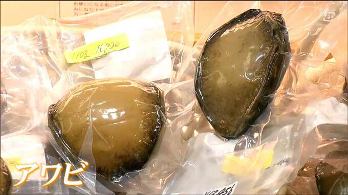 輪島の朝市から出展した店では。通常の倍以上のサイズのアワビが、真空の状態で販売されています。