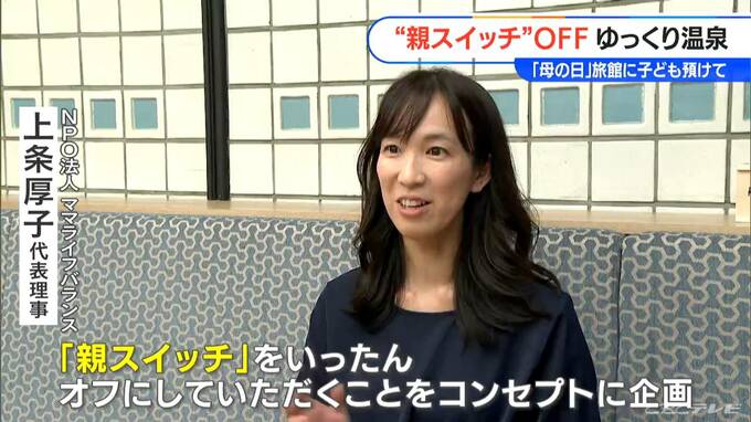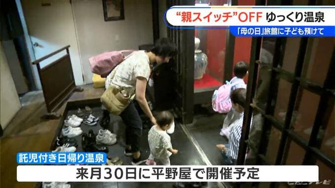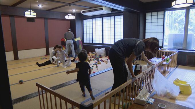 旅館の一室で保育士や看護師らが5時間、小学生未満の子どもを預かります。12日は“母の日価格”で、1人9900円で実施。県内などから夫婦5組と母親3人が利用しました。
