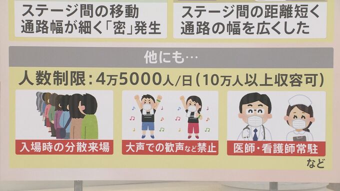 1日あたり人数制限は4万5000人です。10万人以上収容可能なので、かなり人数を絞っているといえます。その上で▼入場時の分散来場、▼大声での歓声などを禁止、▼医師・看護師が常駐するなど、様々な対策を行って開催されます。