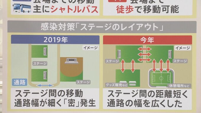 ひたち海浜公園はステージが点在していて、ステージ間の移動に利用する通路が狭く、“密”が発生するリスクがあります。一方、今年の会場はステージ間の距離を短くし、通路の幅を広くして直接移動できる形にしたということです。