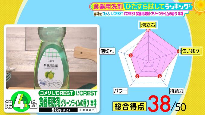 第4位は、コメリ L’CREST(ルクレスト)の『L’CREST 食器用洗剤 グリーンライムの香り 本体』(税込98円 ※番組調べ)。