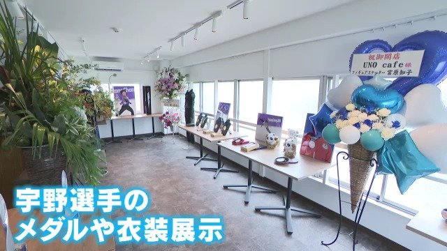 ここでは、愛犬と一緒に食事やお酒を楽しめるだけではなく、宇野選手がオリンピックで獲得したメダルや衣装など、スケート人生を感じられる貴重な品々やサインも展示されています。