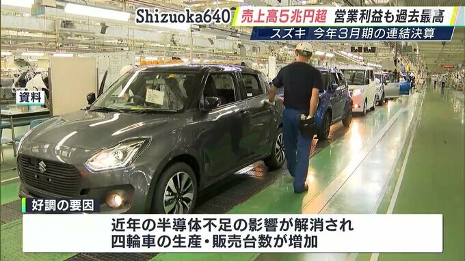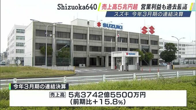 浜松市に本社を置く自動車メーカー「スズキ」は半導体不足の解消や円安などを追い風に売上高、営業利益ともに過去最高を更新しました。