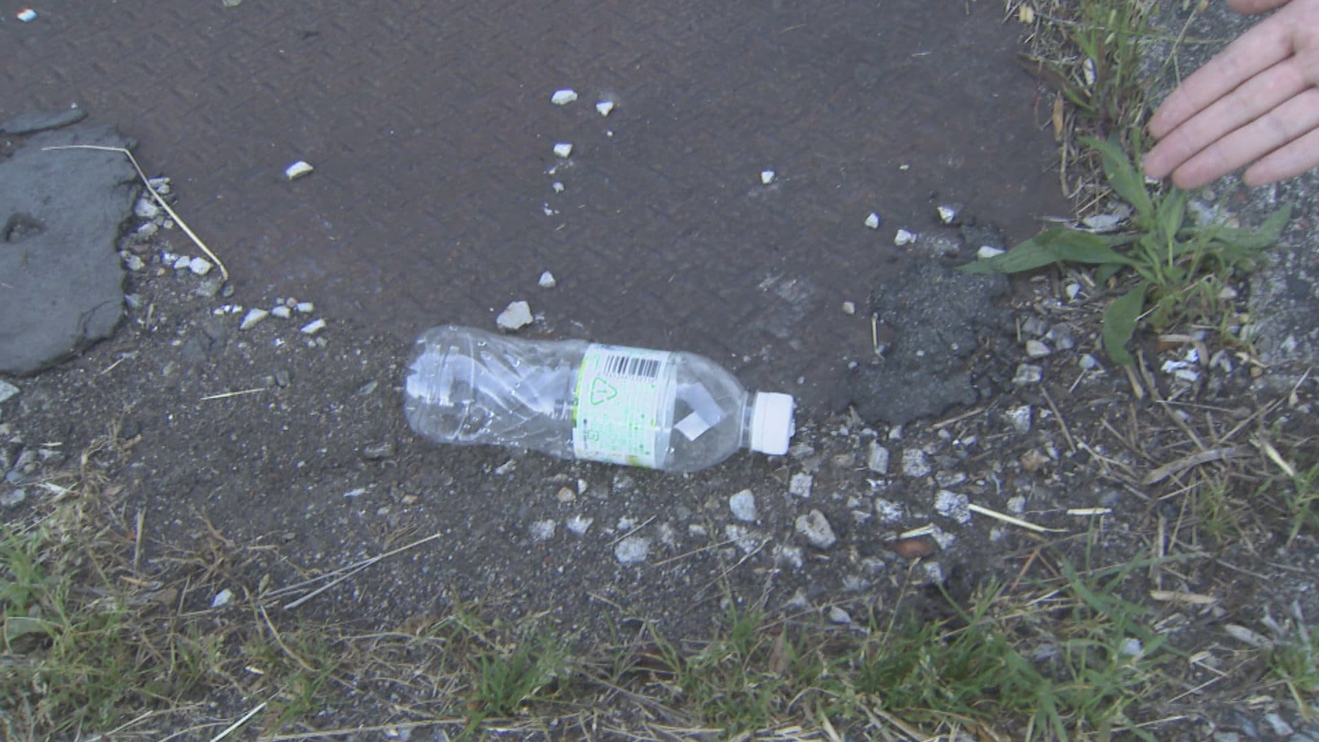 記者:「建物のそばにはペットボトルが落ちています。最近捨てられたもののようです」