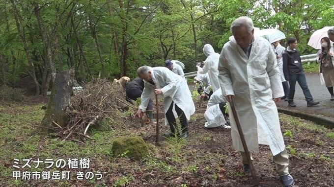 この活動は甲府市と、甲府出身でサントリー名誉チーフブレンダーの輿水精一さんらが行ったもので、5月13日は関係者およそ10人が「ミズナラ」の苗20本を市有林に植樹しました。