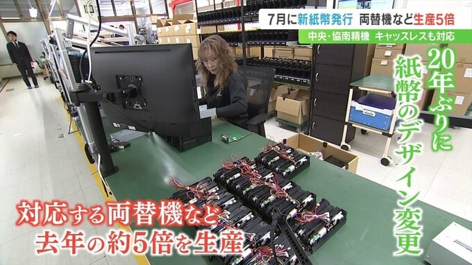 この7月に20年ぶりに紙幣のデザインが変更されることに合わせて、全国から新紙幣に対応する両替機などの注文が相次ぎ、去年の約5倍、ひと月に約1000台を生産しています。