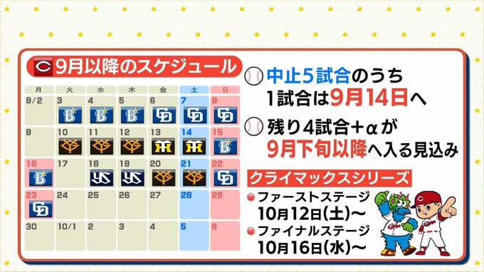 これで9/10~16が7連戦になることは確定しました。残りの中止4試合と+今後、中止になるプラスアルファ分が9月下旬以降に入りそうなんですけれども、1試合あたり2日かかるので、このまま中止がなかったとしても、だいたい9/30週あたりがシーズン最終戦かなという感じなんです。