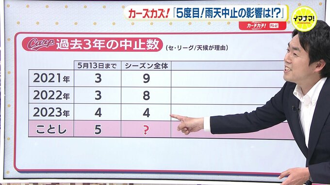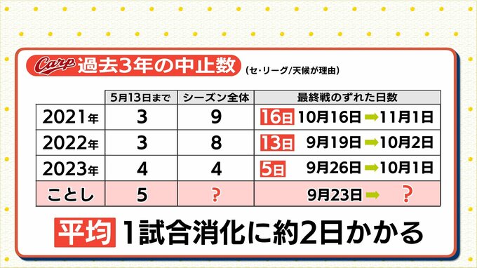 今後の日程が気になるんですが、その前に、ことしは中止が多いのかどうかを調べてみました。5月13日を基準に過去3年、セ・リーグを相手に天候が理由の中止の数を調べました。まあまあ多いんですが、過去3年もあることはあるようです。その後、シーズン全体ではどれくらいだったかというと…