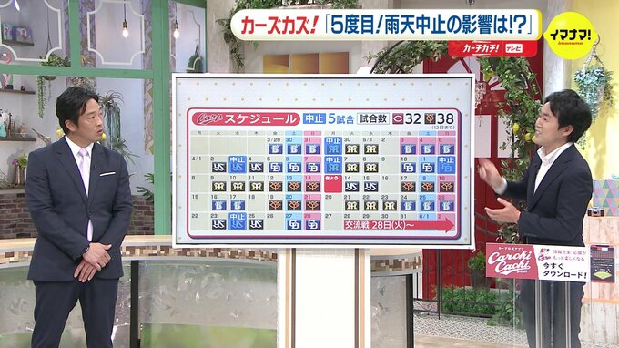 カープが消化したのが、ここまで(5/12現在)32試合。一番多いジャイアンツは中止がなくて38試合。9連戦を1回やって、6連戦をもう3回やっているっていうくらい、スケジュールに差が出ているんです。