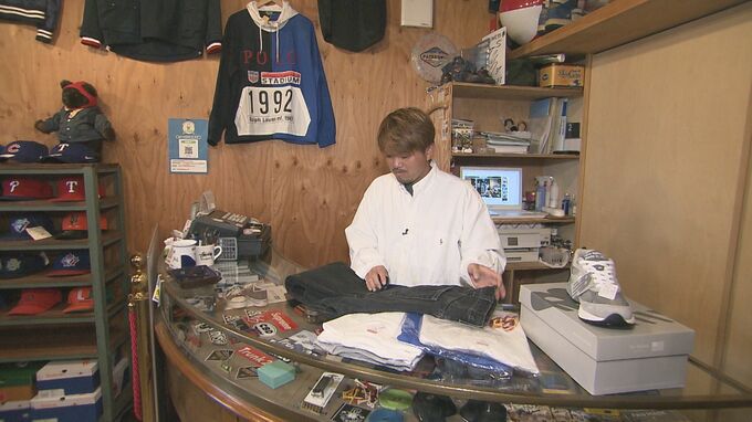 末永万智アナウンサー「古着のシャツやスニーカーなどを取り扱っているこちらのお店では、ほとんどの商品をアメリカから仕入れているということです」