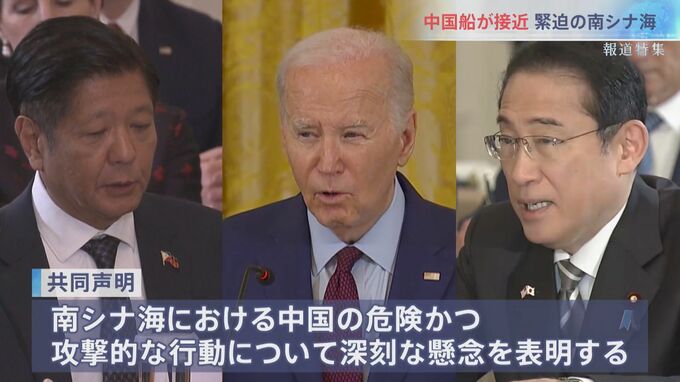4月に行われた、日本、アメリカ、フィリピンの三か国による初の首脳会談。共同声明では、海洋進出を続ける中国の脅威を強調しました。