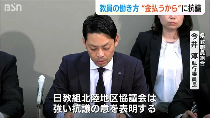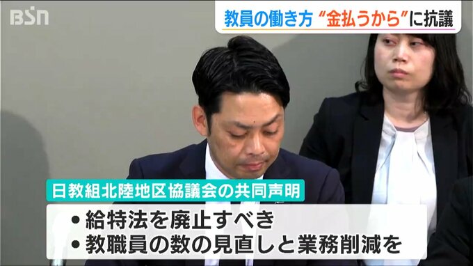 提言を受けて県教職員組合が入る日教組北陸地区協議会は共同声明を発表。まずは「給特法」を廃止すべきで長時間労働は教職員の数を増やし業務を減らすことでしか解決しないと訴えました。